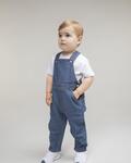 Adjustable straps with YKK poppers, Side seam opening on both sides with YKK poppers, Covered poppers around inseam, Jean style top stitching all over, Two rear patch pockets, Stone washed, Height: 68/80cm 80/86cm 86/92cm 92/98cm 98/104cm 110/116cm